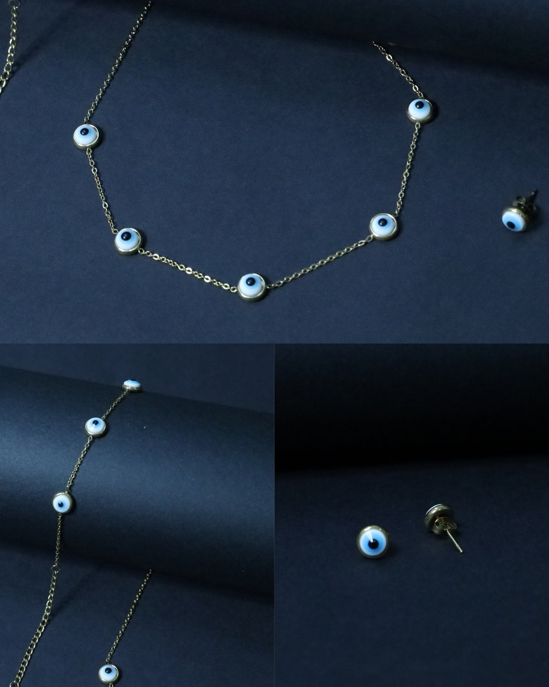 The "Luxe Nazar" set is designed for maximum impact and enduring quality. It features evenly spaced Evil Eye charms across the necklace and bracelet, complemented by simple stud earrings. Every piece is treated with an exceptional anti-tarnish 18k gold plating, ensuring a rich, lasting sheen that resists wear and tear. It's the perfect way to add a meaningful and chic accent to any outfit.
