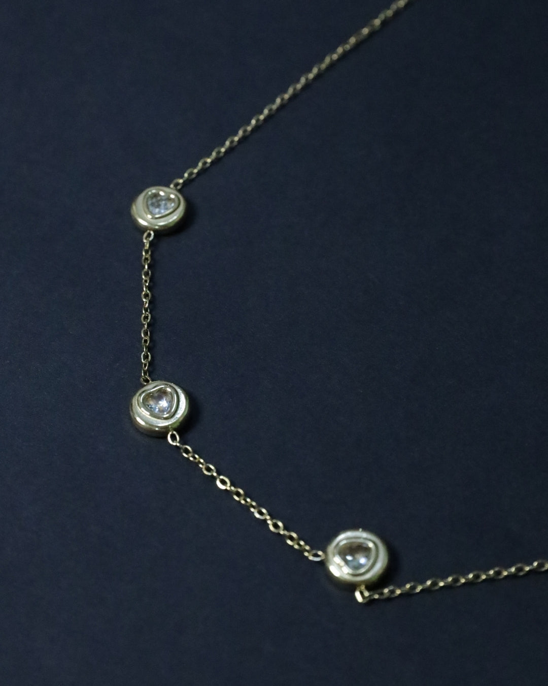 A beautiful and enduring piece from the Stella Luxury Select collection. This elegant necklace features a delicate, anti-tarnish 18k gold plated chain adorned with five (or six) small, bezel-set heart charms, each containing a subtle, sparkling detail (like a tiny crystal or stone). Designed for longevity and everyday wear, this piece is tarnish-resistant and often hypoallergenic. Its dainty design and scattering of heart charms make it a perfect standalone statement or a beautiful layering piece.