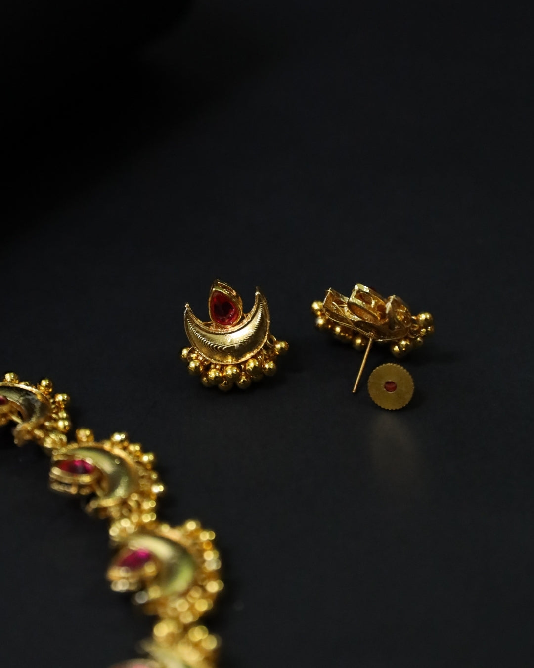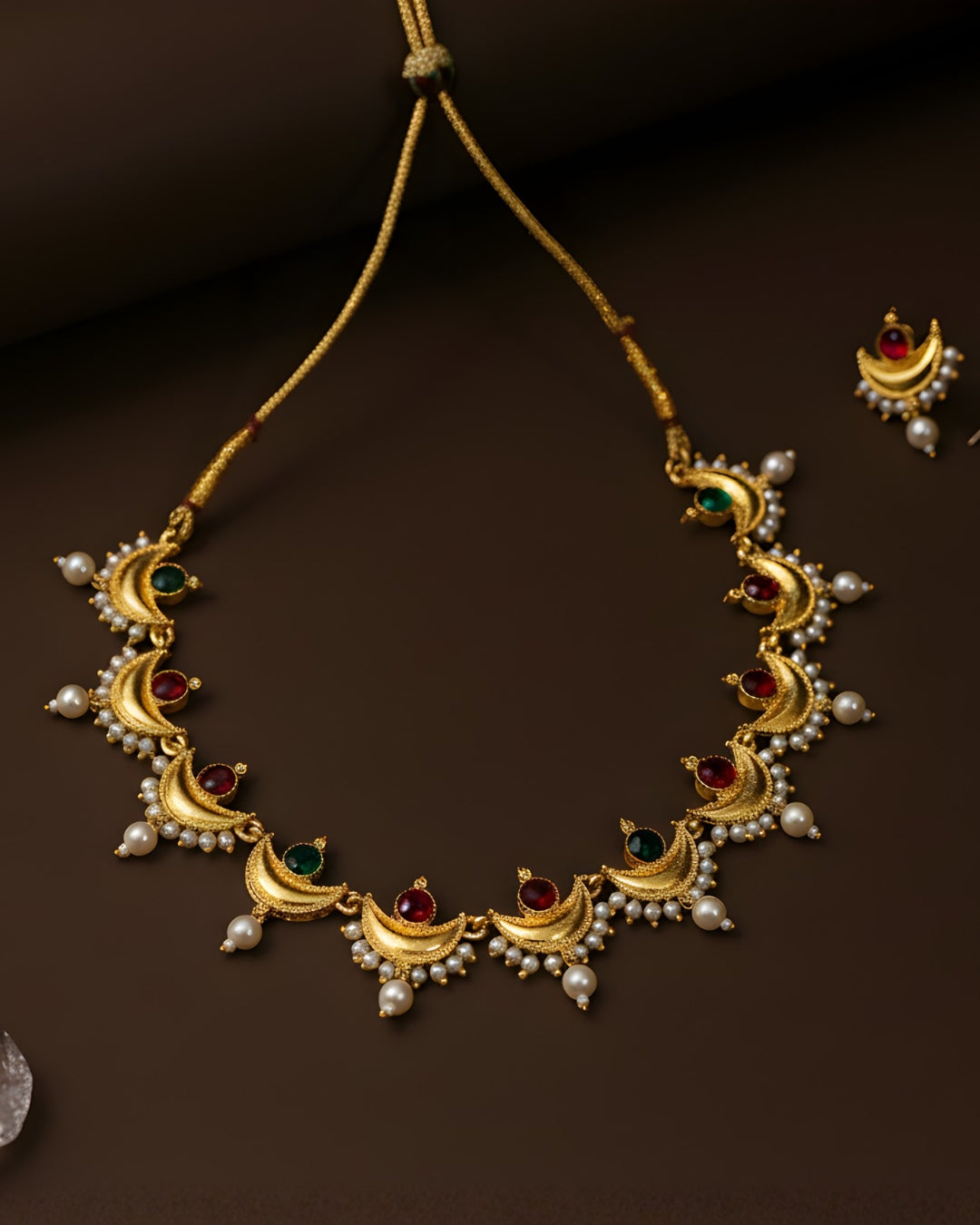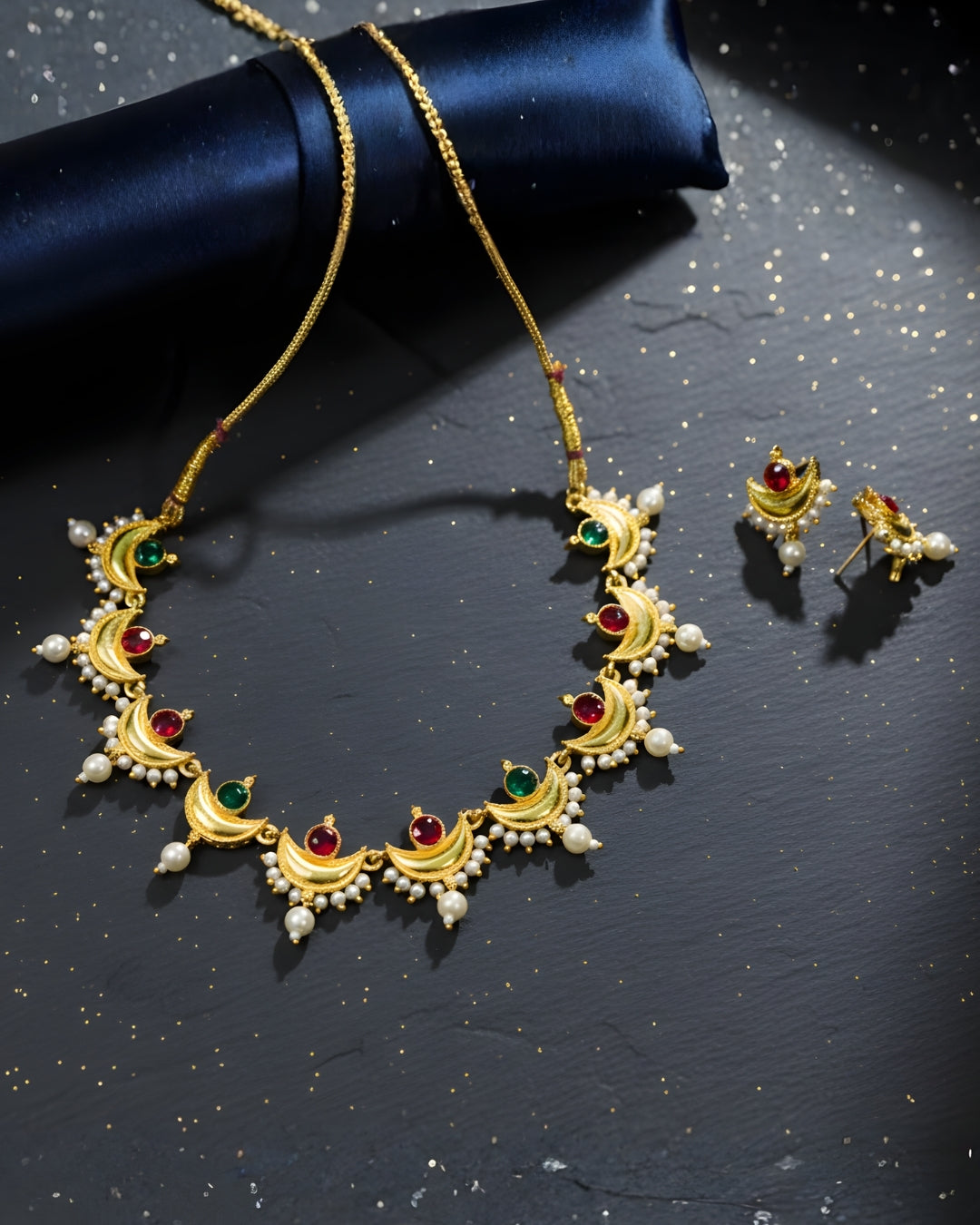 A stunning Maharashtrian Choker in a traditional Thushi style. The design features exquisite Chandra (crescent moon) motifs, detailed with delicate Moti (pearl) clusters and alternating Manik (ruby-red) and Panna (emerald-green) stones. This necklace and matching stud earring set offers a regal, classic look. Perfect for adorning Paithani sarees and traditional festive wear. Comes with an adjustable dori (thread).