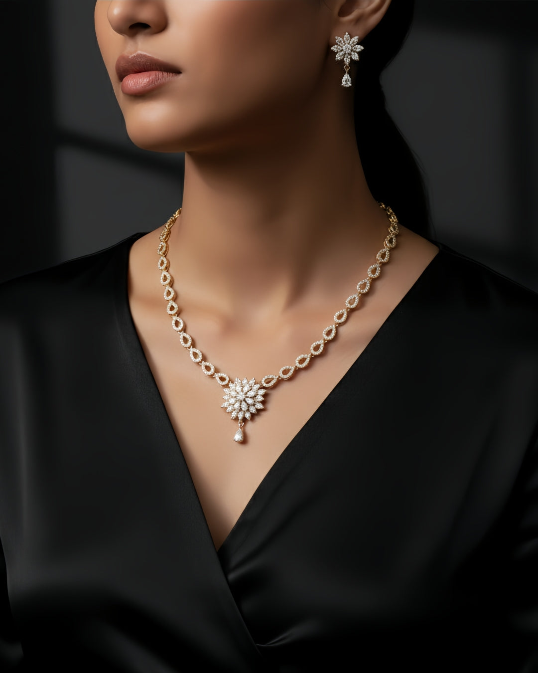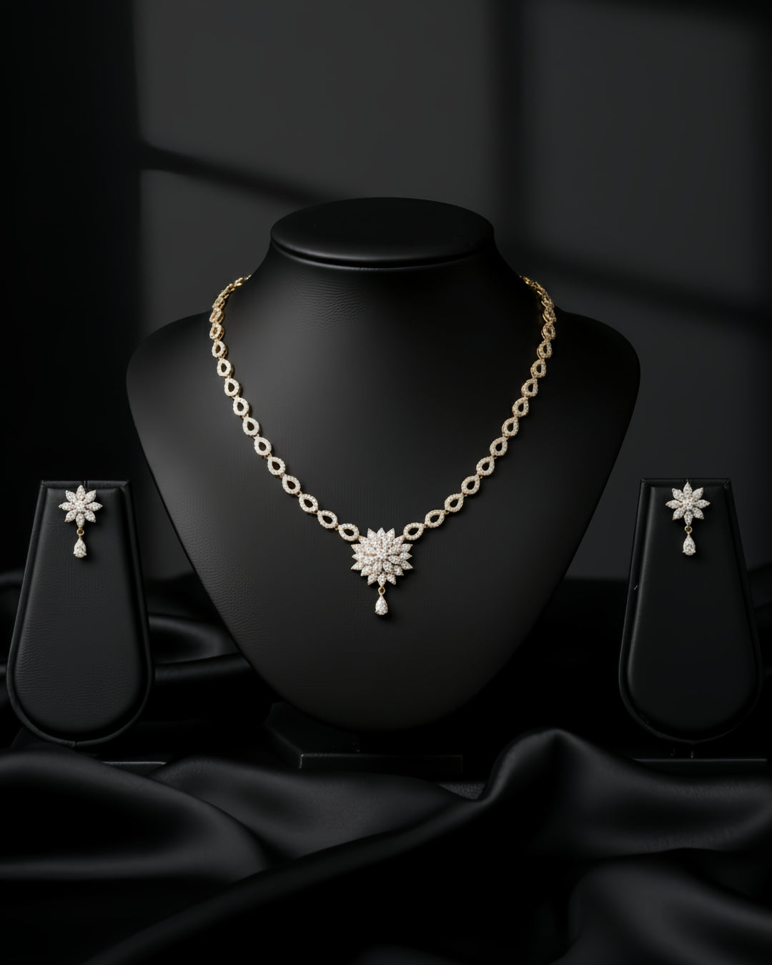 Step out in dazzling style with this exquisite Starburst Fashion Jewelry Set. The eye-catching necklace features an intricate chain of rhinestone-studded infinity links leading to a brilliant, multi-stone floral/starburst pendant with a delicate teardrop dangle. The coordinating stud earrings mirror the floral design and sparkling drop, offering a complete and glamorous look. Finished in a polished gold-tone, this set is perfect for weddings, parties, or any special occasion where you want to shine.