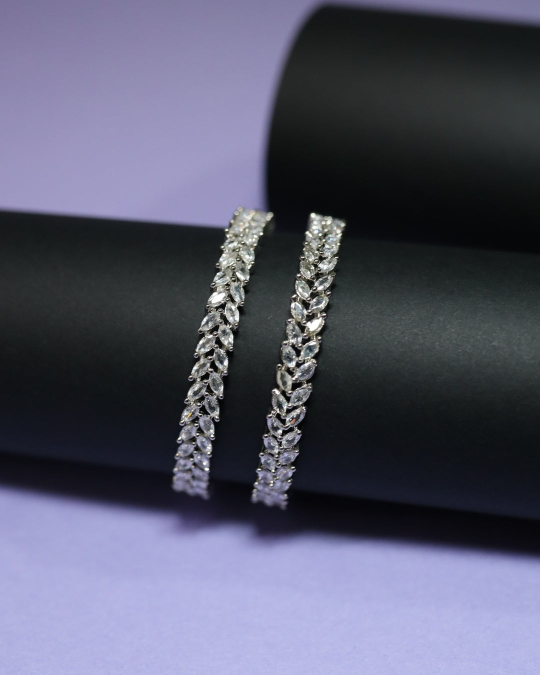 Elevate your wrist stack with this stunning Marquise Leaf Bangle. The bracelet features a continuous, intricate pattern of marquise-cut cubic zirconia (CZ) stones, set side-by-side to resemble glittering laurel leaves or vines. The brilliant silver-tone finish and the abundant use of high-quality CZ stones give this piece the magnificent look of real diamonds. It's a sophisticated choice for formal events, bridal wear, or adding everyday luxury. This listing is for one bangle; purchase two for the bold stacked look.