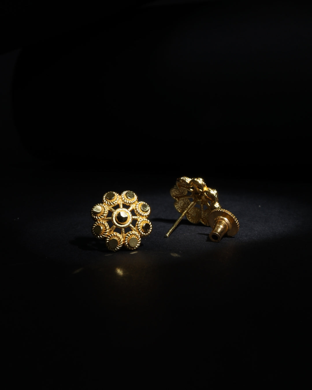 Adorn your ears with these beautifully detailed stud earrings. They feature an intricate floral or rosette motif surrounded by textured gold bead work and a sparkling dark stone accent at the center. Finished with high-quality micro gold plating for a luxurious, enduring glow. A timeless piece perfect for traditional and everyday wear.