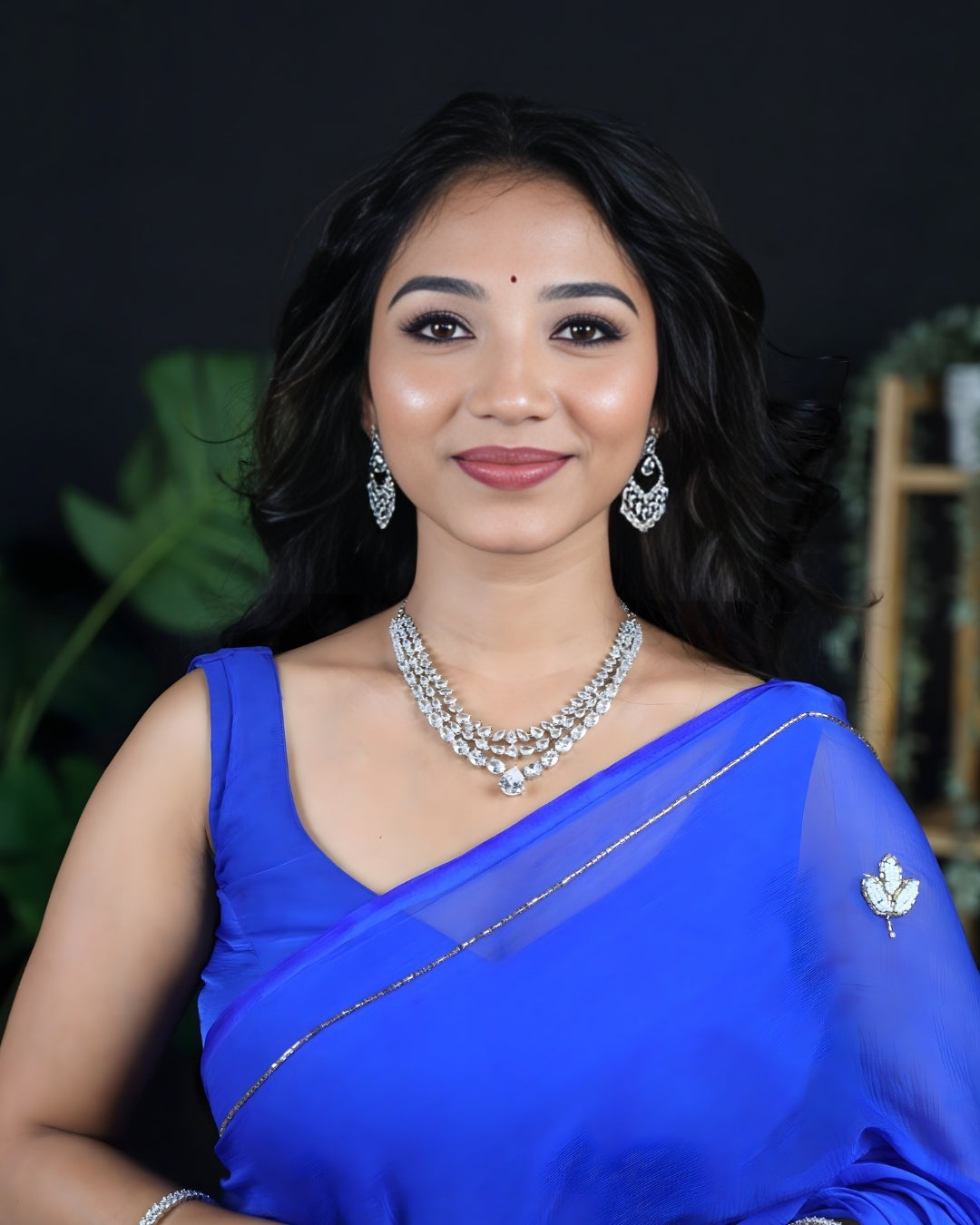 • Earring Design: The accompanying chandelier earrings are designed to complement the necklace's grandeur. They feature an elaborate, cascading pattern of round and pear-shaped simulated diamonds, creating beautiful movement and maximum light reflection.