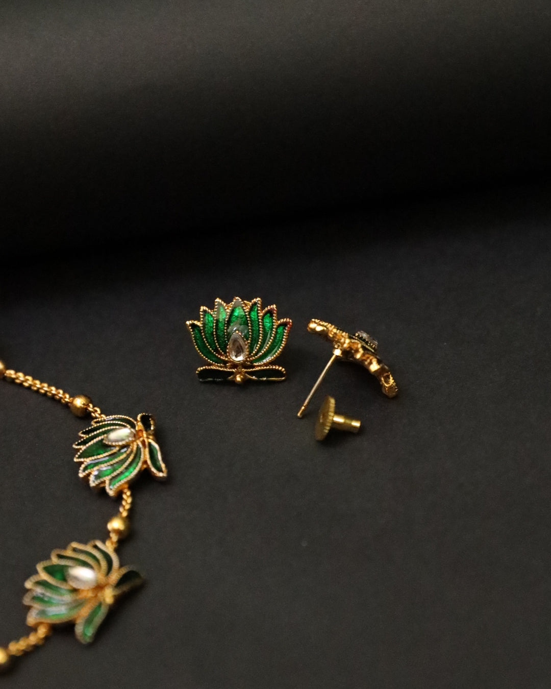 A delicate Meenakari (enameled) necklace set in a modern Choker style. It features exquisite Kamal (lotus) motifs in rich Hirwa (green) enamel, each centered with a luminous Moti (pearl-like) accent. This elegant and unique set, complete with matching stud earrings, symbolizes purity and adds a vibrant, traditional touch to your ethnic wear. Includes an adjustable dori (thread).