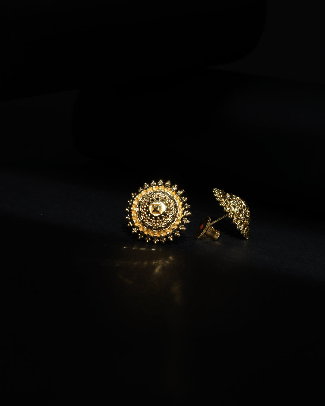 Dazzle with these intricately designed stud earrings. They feature a central Polki/Kundan-style stone, encircled by ornate filigree work and a fine beaded border. Finished with premium micro gold plating, these studs offer a luxurious, enduring shine reminiscent of classic temple jewelry. Perfect for festive occasions or adding sophisticated glamour to your everyday look.