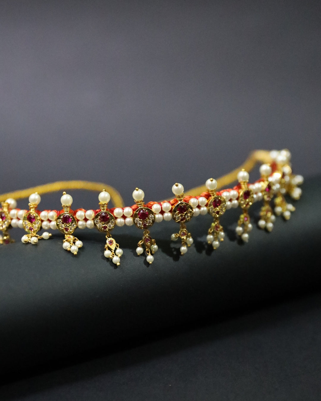 • Design: Dangler Moti Drops & Manik (Red Stone) Accents