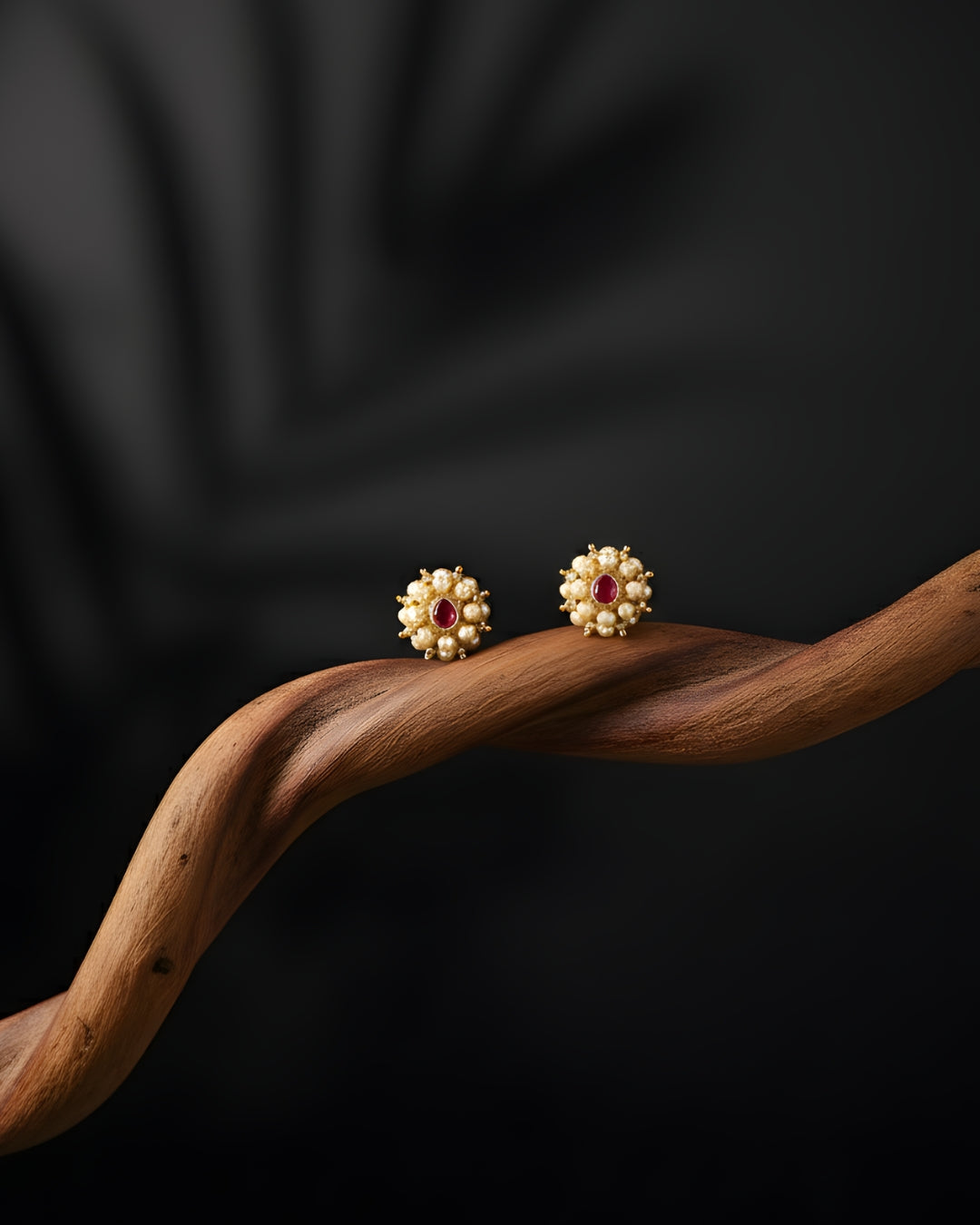 Eye-catching pearl and gold-plated alloy studs. Features a vibrant colored stone setting, giving it a Kundan/Polki-inspired look. Lightweight and brilliant for daily or occasional wear.