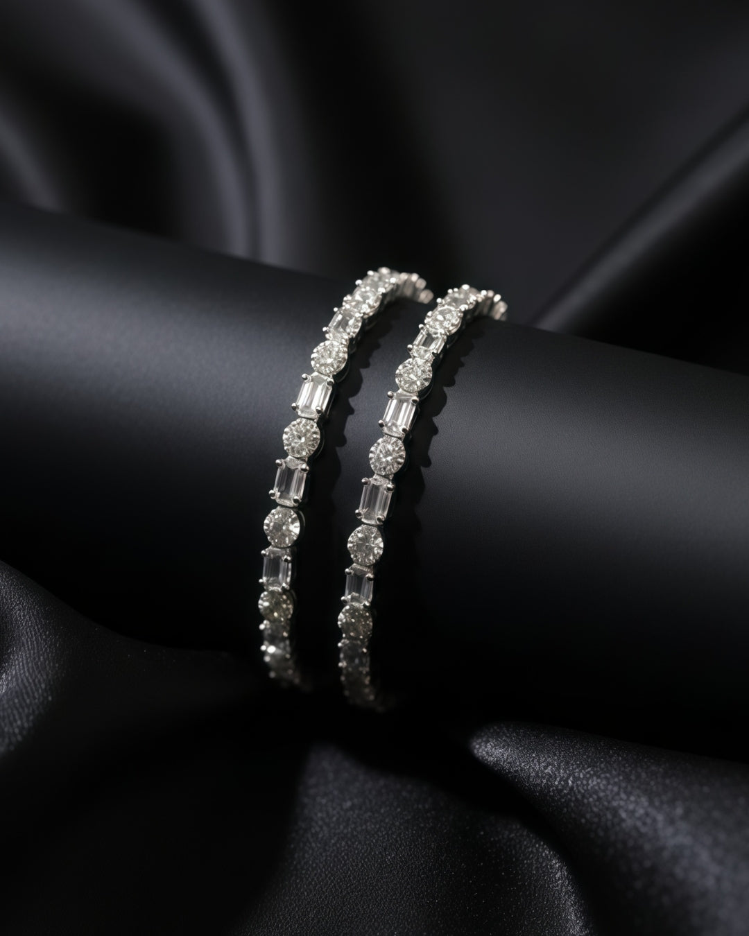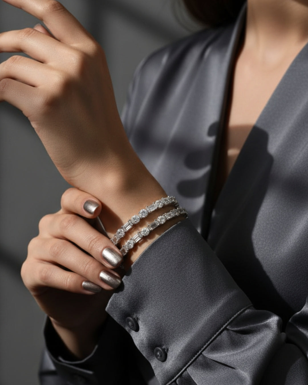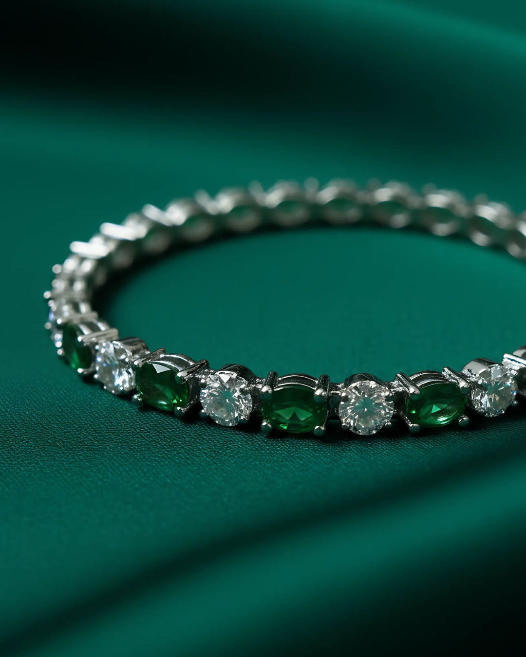 Add a pop of regal color and sparkle to your wrist with this stunning tennis-style bracelet. The design features a continuous line of alternating oval-cut emerald-green cubic zirconia (CZ) stones and brilliant round-cut white CZ stones, all set in a lustrous silver-tone finish. Each stone is perfectly framed to enhance its brilliance, creating a sophisticated and luxurious look that easily transitions from a formal evening event to an elegant daytime stack. This piece is ideal for those who love the look of expensive emerald and diamond jewelry at an accessible price. Purchase two for the elegant stacked look shown in the image.