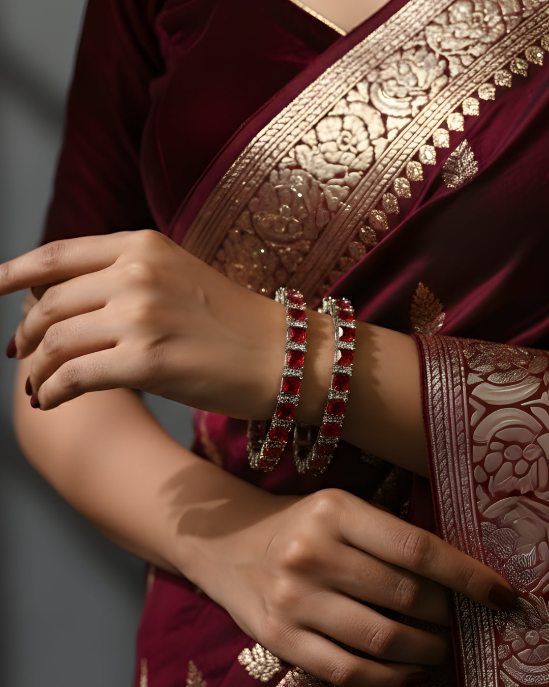 Adorn your wrist with a touch of royal elegance. This exquisite set of 2 bangles features vibrant Ruby-Red stones cut in a striking Emerald shape. Set in a gleaming finish (likely Gold-Tone or Antique Gold-Plated), these bangles are perfect for adding a majestic flair to your ethnic, festive, or bridal ensemble. A timeless piece that beautifully blends traditional charm with contemporary design.