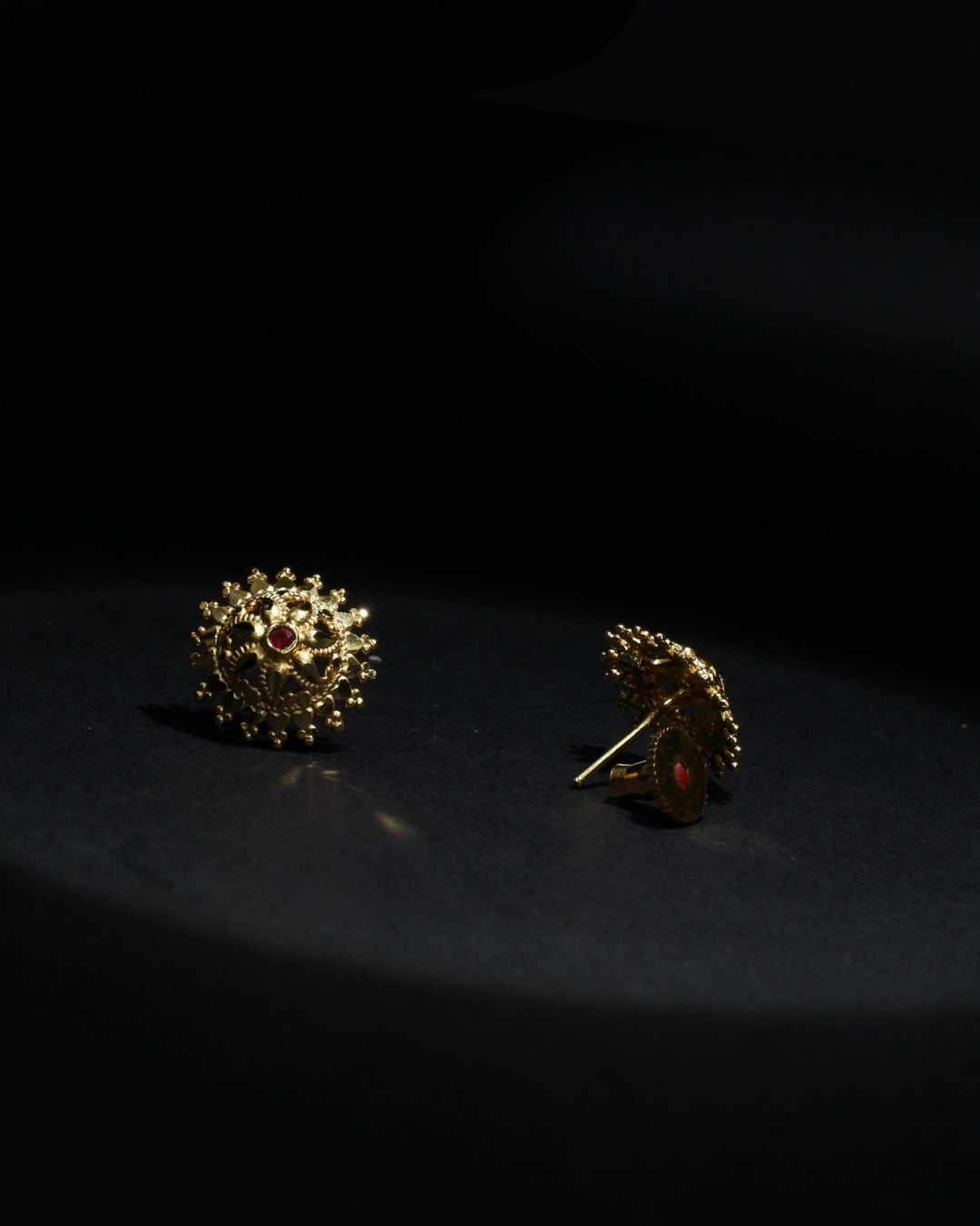 Traditional micro-plated gold studs featuring a vibrant ruby (or red) stone at the centre, framed by intricate beadwork and a striking outer spoke design. Elegant and eye-catching