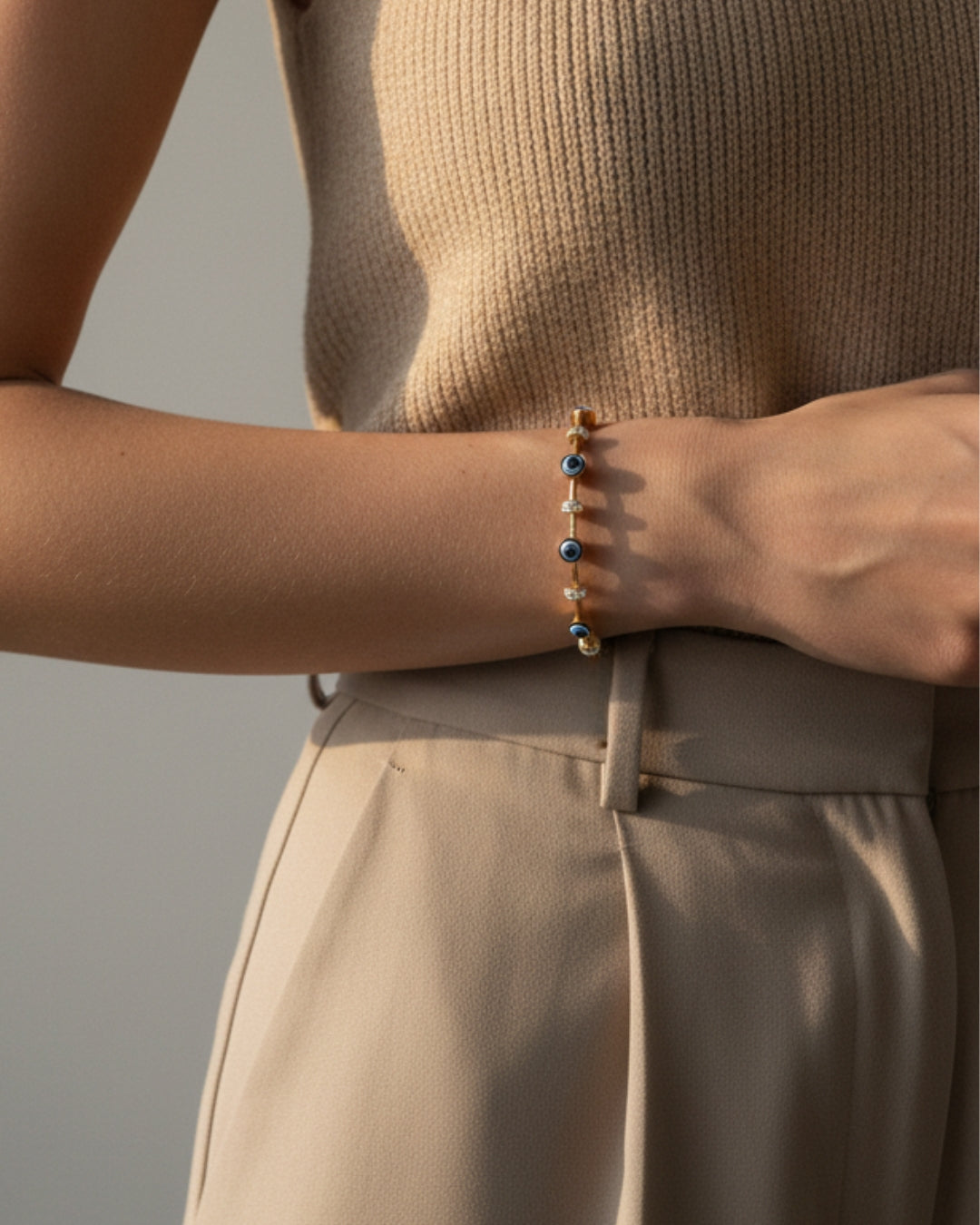 • Evil Eye Charms: Features vibrant blue enamel and crystal-studded Evil Eye charms, alternating with sparkling clear Cubic Zirconia (CZ) accents to catch the light beautifully.